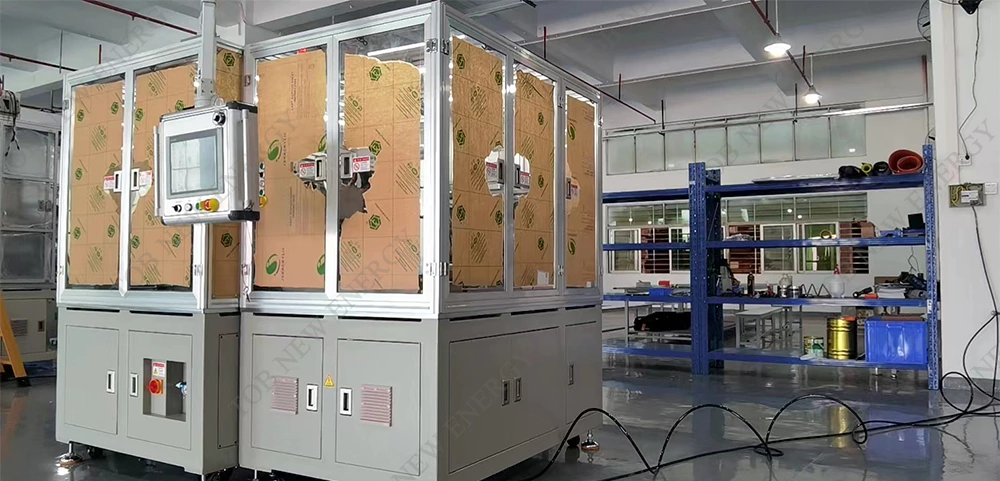 There are four sets of press-blade mechanisms on the stacking table to compress the electrodes. After the stacking is completed, the cell is removed through the manipulator clamping mechanism, the separator is cut off, and the cell is transferred to the taping station for automatic taping.