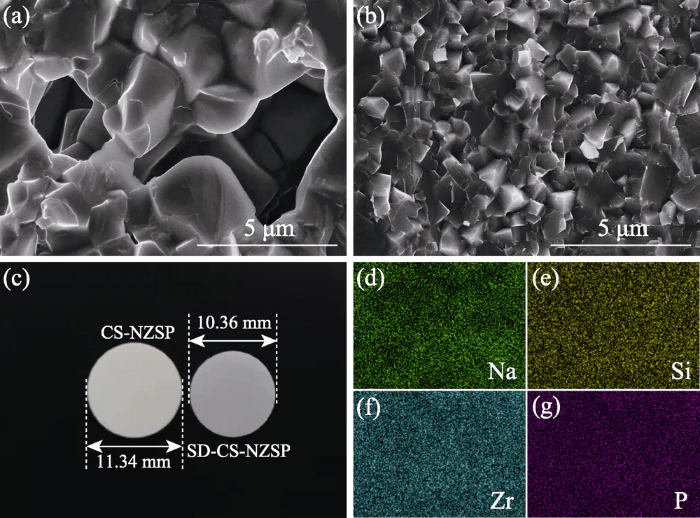 Figure 4 shows the physical picture of the Na3Zr2Si2PO12 ceramic sheet, its cross-sectional morphology and elemental analysis diagram. Figure 4(a) shows the cross-sectional morphology of the ceramic piece obtained by the conventional sintering method. It was observed that there were many irregular pores in the cross section of the ceramic sheet, and the local pore diameter exceeded 5 μm. The reason is that the particle size after grinding is uneven, there are larger particles, and there is no close contact between the particles, resulting in more irregular pores in the ceramic sheet during the secondary sintering process. Figure 4(b) shows the cross-sectional morphology of the ceramic piece obtained by the spray drying method. The crystal grains are in close contact with each other and there are no obvious pores. This shows that Na3Zr2Si2PO12 particles with regular shape and concentrated particle size distribution can easily obtain high-density ceramic sheets during the secondary sintering process. The increase in density is also reflected in the increase in shrinkage of the ceramic body after sintering, as shown in Figure 4(c). On the left is a ceramic piece obtained by the conventional sintering method, with a diameter of 11.34 mm, and a shrinkage rate of only 5.5%; on the right is a ceramic piece obtained by the spray drying method, with a diameter of 10.36 mm, and a shrinkage rate of 13.7%. In order to explore the composition of each element in the sample, elemental analysis was performed on the cross section of the ceramic piece (Figure 4(b)), and Figure 4(d~g) was obtained. The content of each element is shown in Table 3. Each element is evenly distributed on the cross section of the ceramic piece, and there is no aggregation of elements. According to Table 3, it is found that the atomic percentage of Na and P is 2.98:1, which is basically consistent with the standard chemical formula of Na:P=3:1, indicating that excess Na and P in the raw materials can compensate for the volatilization of Na and P during the sintering process.