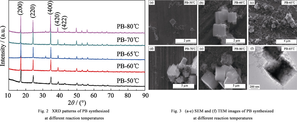 (1) The reaction temperature has an effect on the crystallinity, stacking and yield of PB. Under the condition of 50-80 °C, with the increase of temperature, the crystallinity of the formed PB grains is getting better and better, while the stacking phenomenon becomes more and more. The more serious it is, the yield also increases, and the yield of PB synthesized at 80℃reaches 96.5%. The electrochemical performance test shows that the battery assembled with PB synthesized at 80℃as the cathode material has excellent cycle performance, and the capacity retention rate reaches 93.9% after 100 charge-discharge cycles. However, the battery assembled with PB synthesized at 65℃has better rate performance, and its specific discharge capacity is 48.1 mAh/g at a charge-discharge current density of 1.0 A/g.